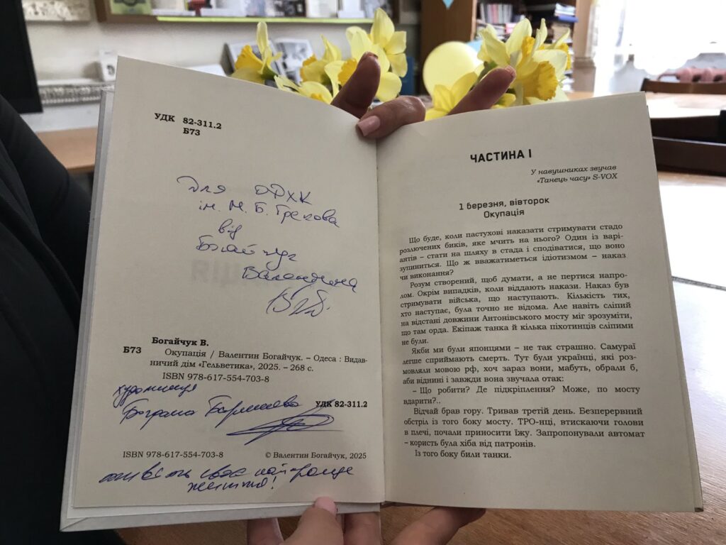 Ганна Володимирівна разом із студентами «Грековки» 2 квітня відвідали презентацію книги В. Богайчука «Окупація» (Одеса, 2025), яка проходила в Одеській національній науковій бібліотеці.