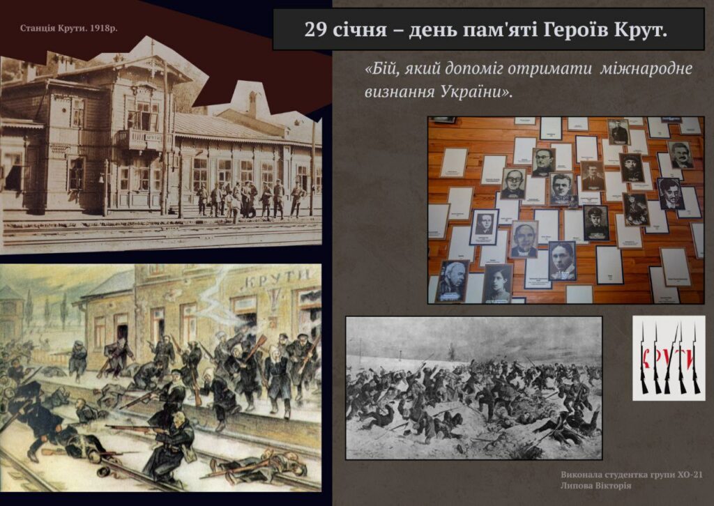 Цього дня Україна вшановує подвиг молодих патріотів — студентів, курсантів і бійців Вільного козацтва, які у 1918 році поблизу станції Крути стали на захист незалежності Української Народної Республіки. У нерівному бою з багатотисячною більшовицькою армією вони ціною власних життів змогли стримати наступ ворога та виграти дорогоцінний час для української держави.